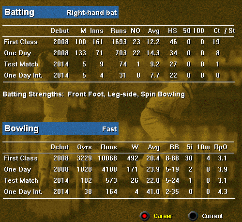 form with the ball has made him the opening bowler for recent macthes. John's averages of 20.4 in Domestic Cricket, 23.9 in Domestic one dayer's & 22 in Tests