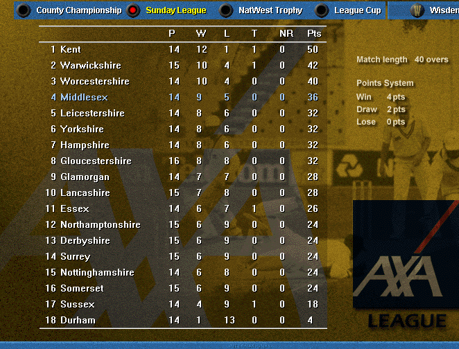 Middlesex's sunday league hopes hang by a thread, they could win the Sunday league this year (1998) - but more than likely