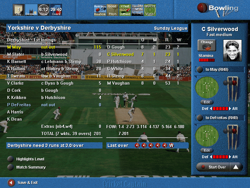 run rate required back from 1.8 to 2.7. Hutchinson bowled one wicket maiden to leave Chris Silverwood with the problem of bowling the last over against the possible Man of the Match - May.